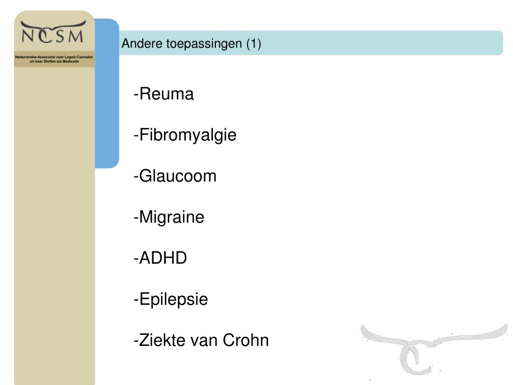 Andere toepassingen (1) Nederlandse Associatie voor Legale Cannabis en haar Stoffen als Medicatie -Reuma -Fibromyalgie -Glaucoom -Migraine -ADHD -Epilepsie -Ziekte van Crohn