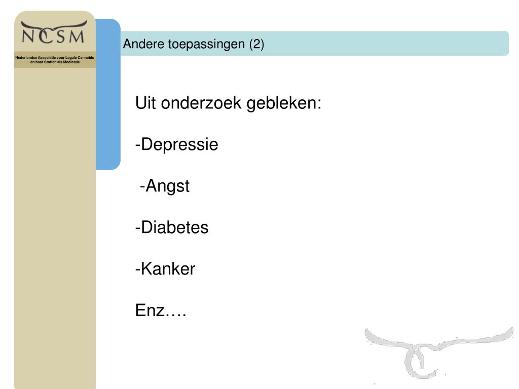 Andere toepassingen (2) Nederlandse Associatie voor Legale Cannabis en haar Stoffen als Medicatie Uit onderzoek gebleken: -Depressie -Angst -Diabetes -Kanker Enz….