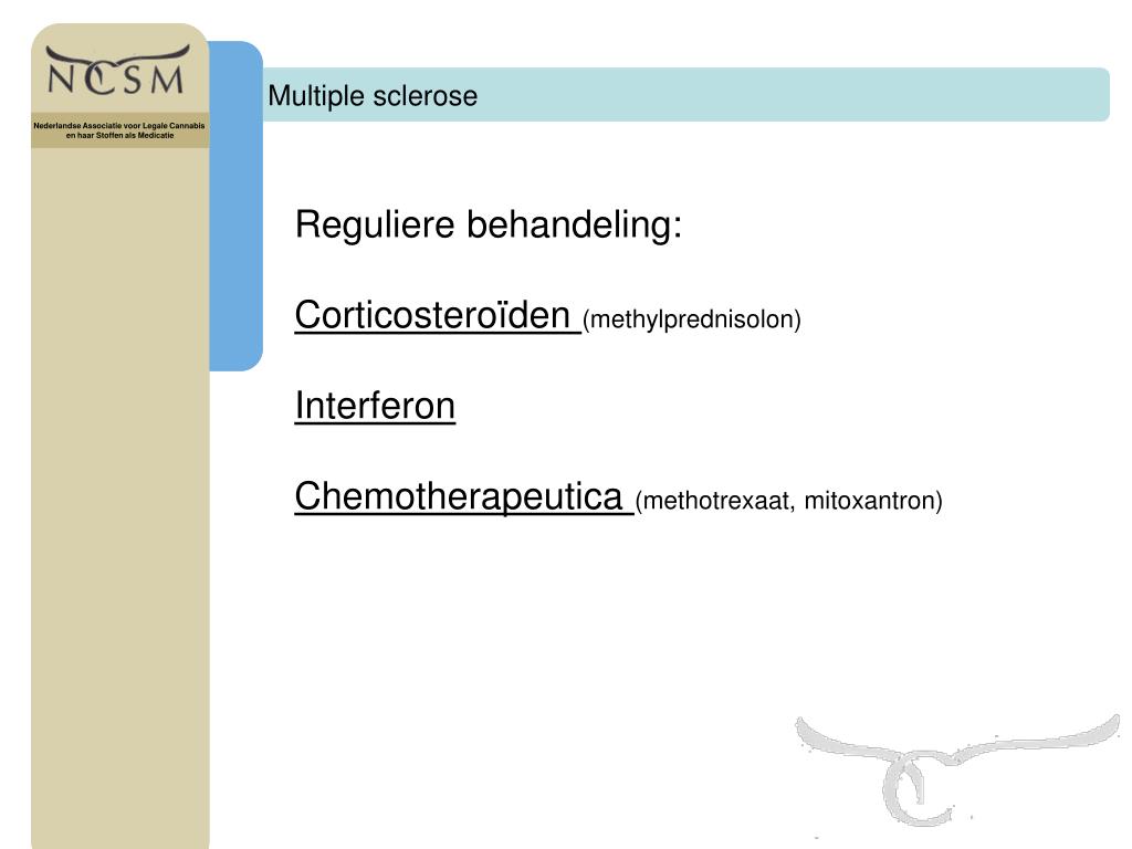 Multiple sclerose Nederlandse Associatie voor Legale Cannabis en haar Stoffen als Medicatie Reguliere behandeling: Corticosteroïden (methylprednisolon) Interferon Chemotherapeutica (methotrexaat, mitoxantron)