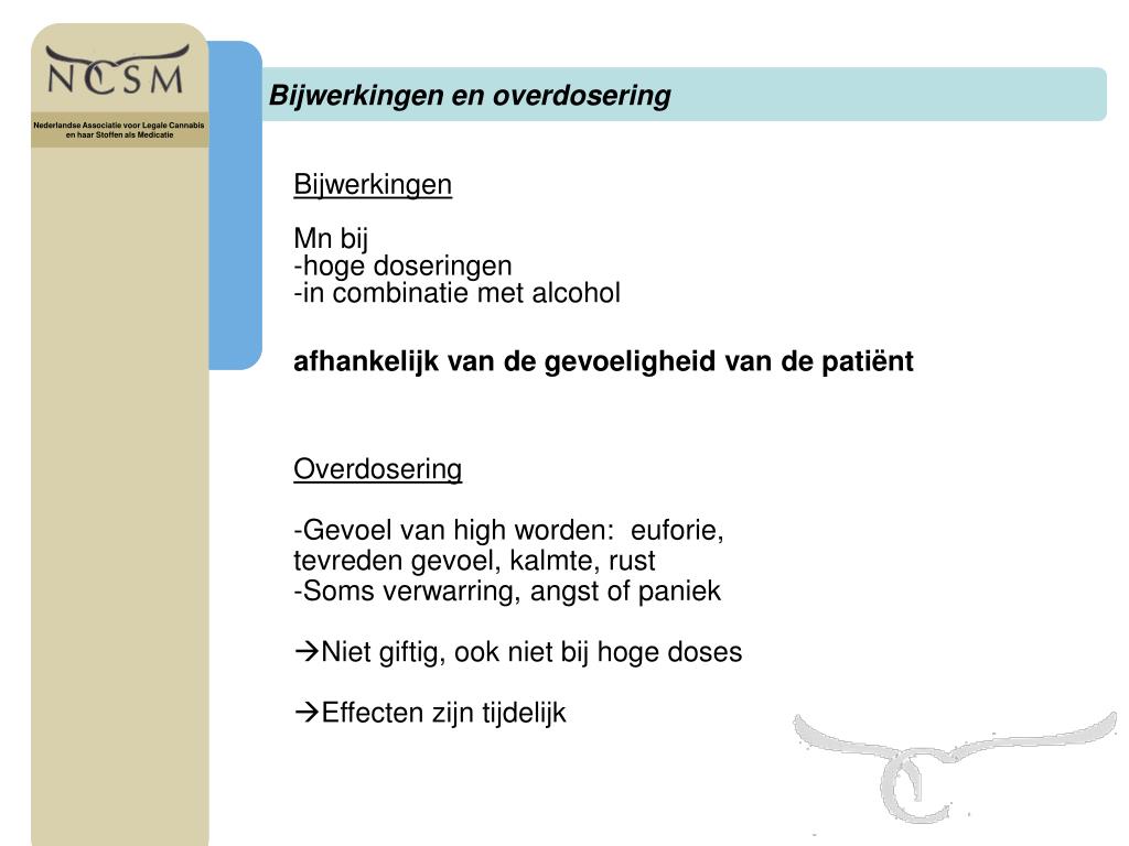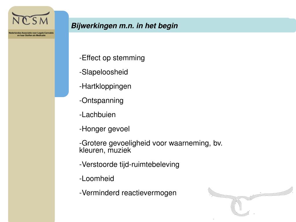 Bijwerkingen m.n. in het begin Nederlandse Associatie voor Legale Cannabis en haar Stoffen als Medicatie -Effect op stemming -Slapeloosheid -Hartkloppingen -Ontspanning -Lachbuien -Honger gevoel -Grotere gevoeligheid voor waarneming, bv. kleuren, muziek -Verstoorde tijd-ruimtebeleving -Loomheid -Verminderd reactievermogen