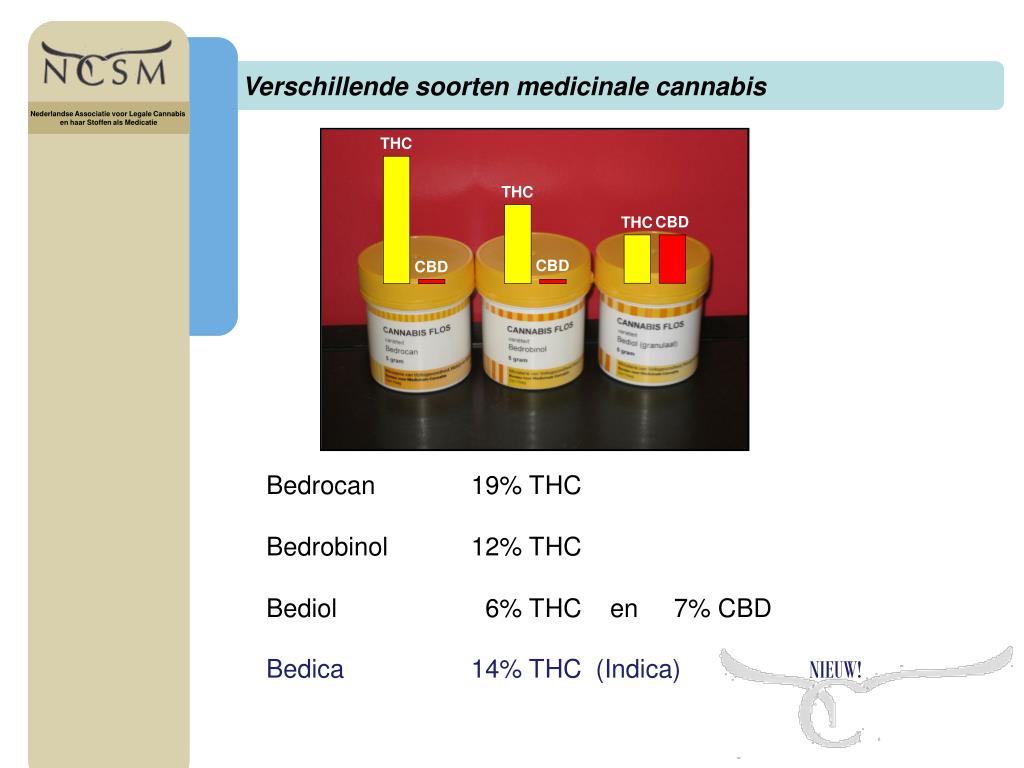 Verschillende soorten medicinale cannabis Nederlandse Associatie voor Legale Cannabis en haar Stoffen als Medicatie Bedrocan 19% THC Bedrobinol 12% THC Bediol 6% THC en 7% CBD Bedica 14% THC (Indica) NIEUW!