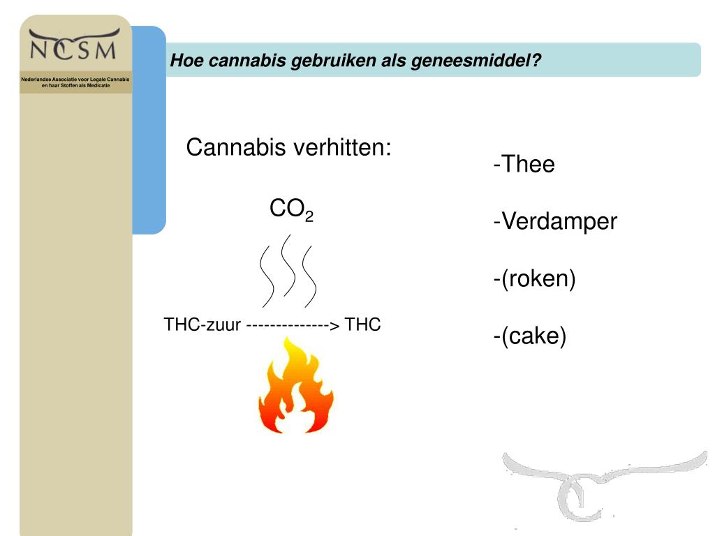 CO2 Hoe cannabis gebruiken als geneesmiddel? Nederlandse Associatie voor Legale Cannabis en haar Stoffen als Medicatie Cannabis verhitten: -Thee -Verdamper -(roken) -(cake) THC-zuur --------------> THC