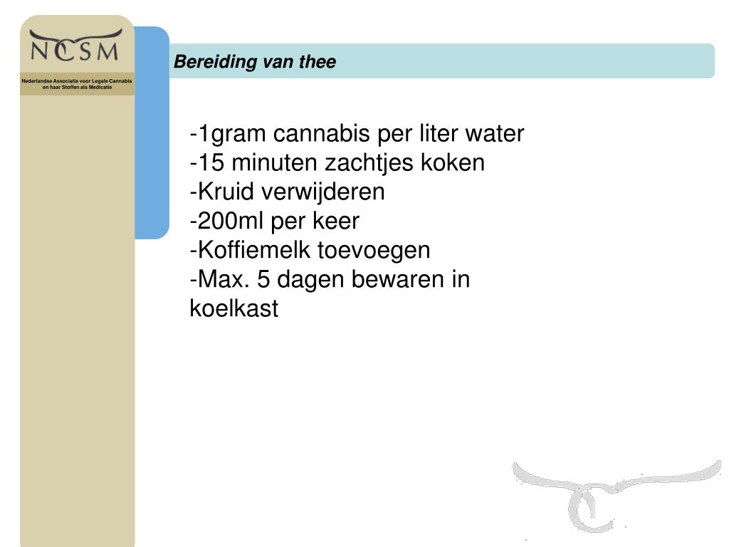 Bereiding van thee Nederlandse Associatie voor Legale Cannabis en haar Stoffen als Medicatie -1gram cannabis per liter water -15 minuten zachtjes koken -Kruid verwijderen -200ml per keer -Koffiemelk toevoegen -Max. 5 dagen bewaren in koelkast