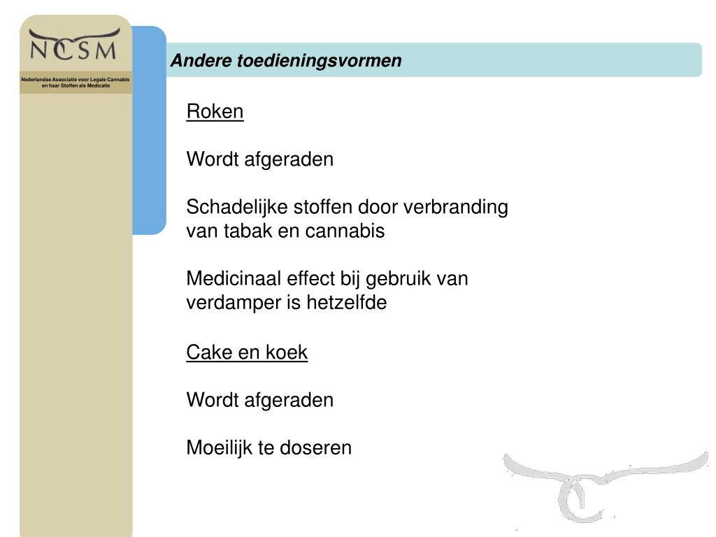 Andere toedieningsvormen Nederlandse Associatie voor Legale Cannabis en haar Stoffen als Medicatie Roken Wordt afgeraden Schadelijke stoffen door verbranding van tabak en cannabis Medicinaal effect bij gebruik van verdamper is hetzelfde Cake en koek Wordt afgeraden Moeilijk te doseren