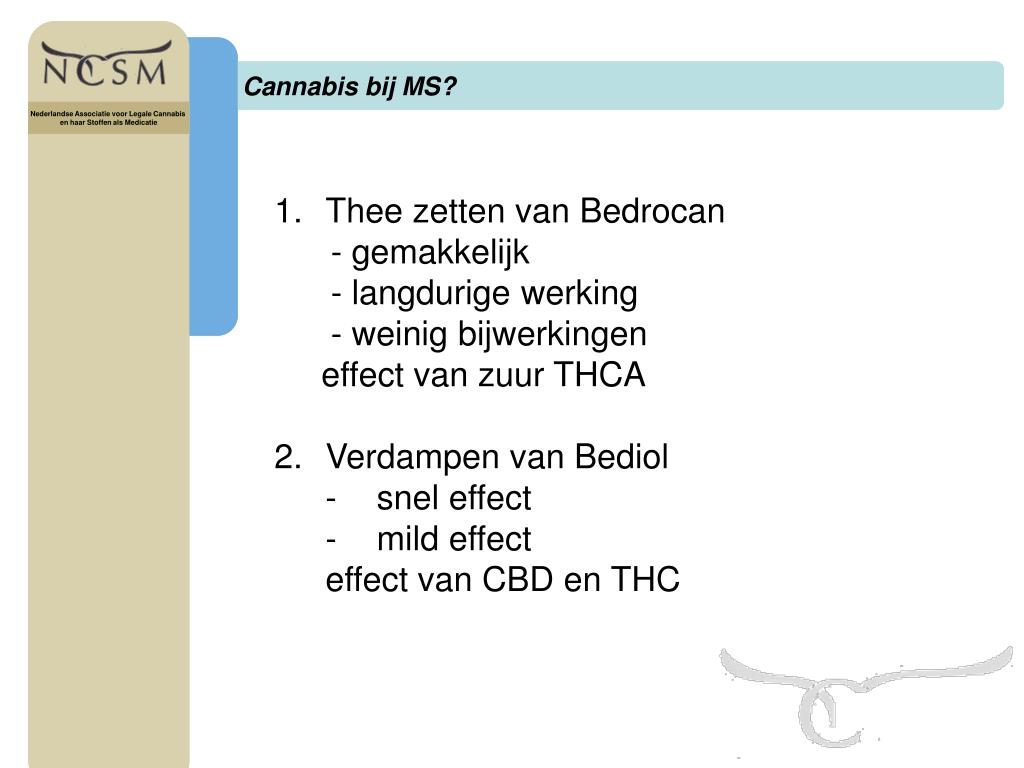 Cannabis bij MS? Nederlandse Associatie voor Legale Cannabis en haar Stoffen als Medicatie • Thee zetten van Bedrocan • - gemakkelijk • - langdurige werking • - weinig bijwerkingen • effect van zuur THCA • Verdampen van Bediol • snel effect • mild effect • effect van CBD en THC