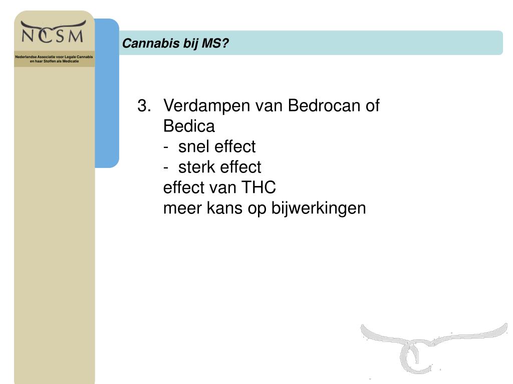 Cannabis bij MS? Nederlandse Associatie voor Legale Cannabis en haar Stoffen als Medicatie • Verdampen van Bedrocan of Bedica • - snel effect • - sterk effect • effect van THC • meer kans op bijwerkingen