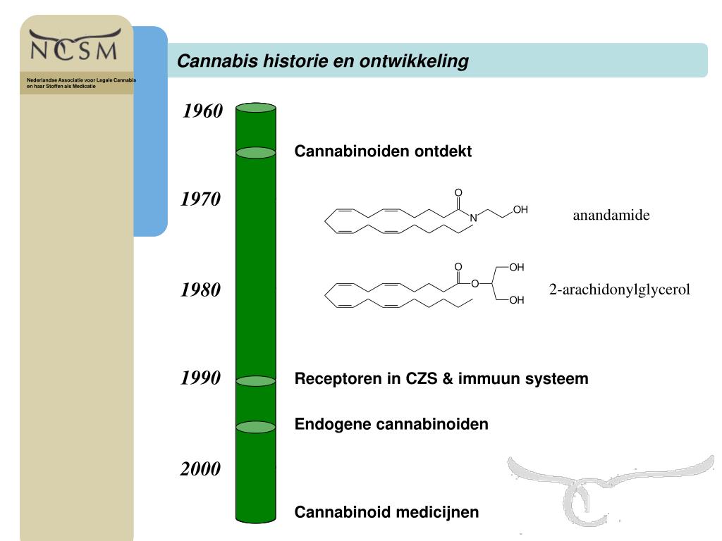 anandamide 2-arachidonylglycerol Receptoren in CZS & immuun systeem Endogene cannabinoiden Cannabinoid medicijnen Cannabis historie en ontwikkeling Nederlandse Associatie voor Legale Cannabis en haar Stoffen als Medicatie 1960 Cannabinoiden ontdekt 1970 1980 1990 2000