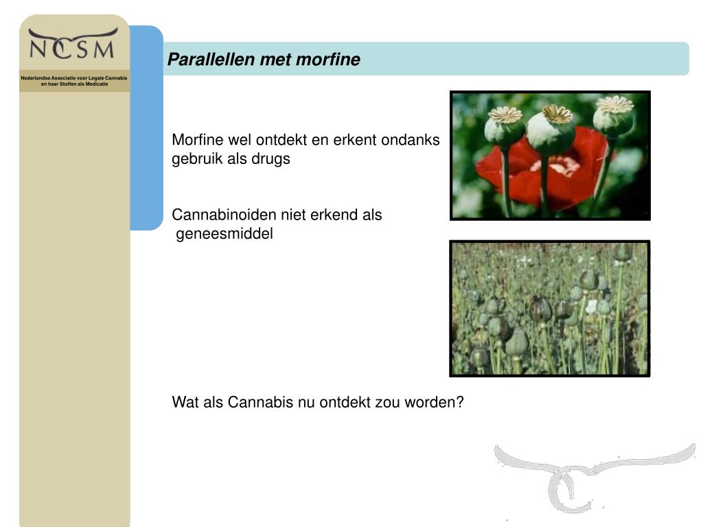 Parallellen met morfine Nederlandse Associatie voor Legale Cannabis en haar Stoffen als Medicatie • Morfine wel ontdekt en erkent ondanks • gebruik als drugs • Cannabinoiden niet erkend als • geneesmiddel • Wat als Cannabis nu ontdekt zou worden?