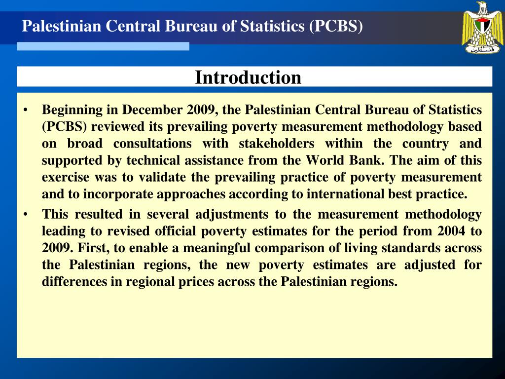 Beginning in December 2009, the Palestinian Central Bureau of Statistics (PCBS) reviewed its prevailing poverty measurement methodology based on broad consultations with stakeholders within the country and supported by technical assistance from the World Bank. The aim of this exercise was to validate the prevailing practice of poverty measurement and to incorporate approaches according to international best practice. This resulted in several adjustments to the measurement methodology leading to revised official poverty estimates for the period from 2004 to 2009. First, to enable a meaningful comparison of living standards across the Palestinian regions, the new poverty estimates are adjusted for differences in regional prices across the Palestinian regions. Introduction