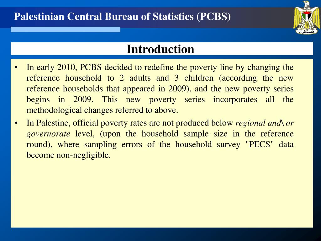 In early 2010, PCBS decided to redefine the poverty line by changing the reference household to 2 adults and 3 children (according the new reference households that appeared in 2009), and the new poverty series begins in 2009. This new poverty series incorporates all the methodological changes referred to above. In Palestine, official poverty rates are not produced below regional and\ orgovernorate level, (upon the household sample size in the reference round), where sampling errors of the household survey "PECS" data become non-negligible. Introduction