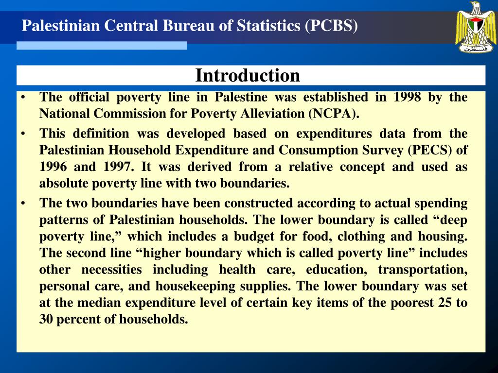 The official poverty line in Palestine was established in 1998 by the National Commission for Poverty Alleviation (NCPA). This definition was developed based on expenditures data from the Palestinian Household Expenditure and Consumption Survey (PECS) of 1996 and 1997. It was derived from a relative concept and used as absolute poverty line with two boundaries. The two boundaries have been constructed according to actual spending patterns of Palestinian households. The lower boundary is called “deep poverty line,” which includes a budget for food, clothing and housing. The second line “higher boundary which is called poverty line” includes other necessities including health care, education, transportation, personal care, and housekeeping supplies. The lower boundary was set at the median expenditure level of certain key items of the poorest 25 to 30 percent of households. Introduction