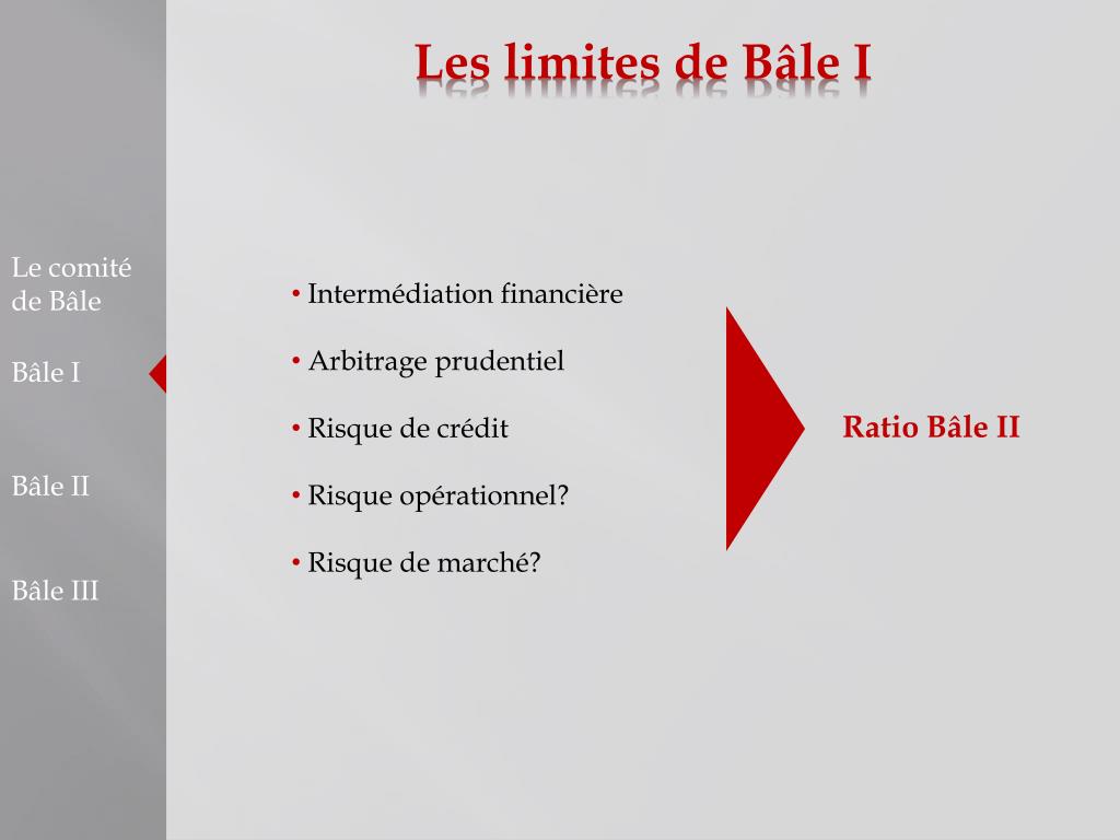 Les limites de Bâle I Le comité de Bâle • Intermédiation financière • Arbitrage prudentiel • Risque de crédit • Risque opérationnel? • Risque de marché? Bâle I Ratio Bâle II Bâle II Bâle III