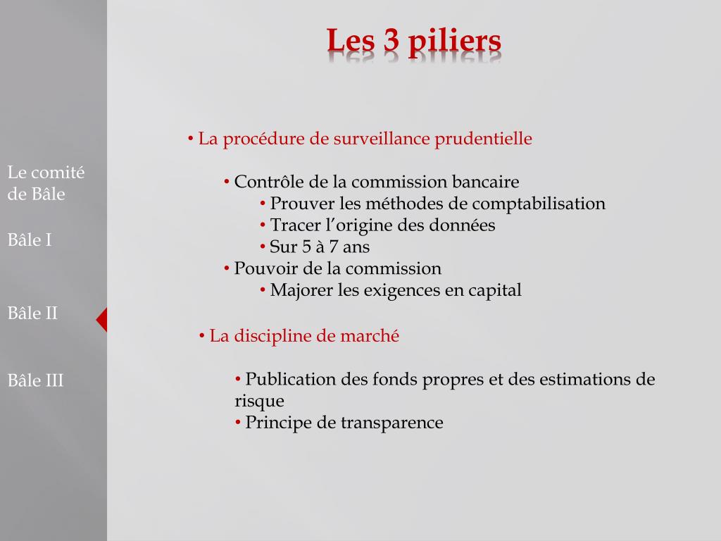 Les 3 piliers • La procédure de surveillance prudentielle • Contrôle de la commission bancaire • Prouver les méthodes de comptabilisation • Tracer l’origine des données • Sur 5 à 7 ans • Pouvoir de la commission • Majorer les exigences en capital Le comité de Bâle Bâle I Bâle II • La discipline de marché • Publication des fonds propres et des estimations de risque • Principe de transparence Bâle III