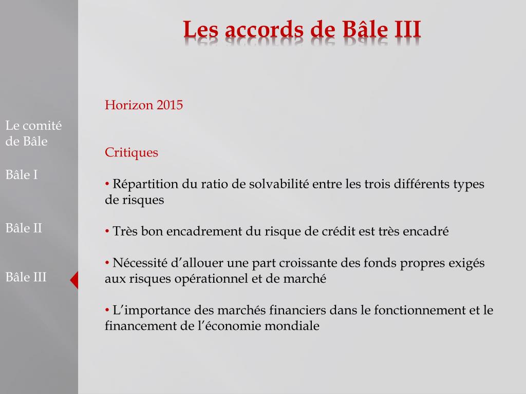 Les accords de Bâle III • Horizon 2015 • Critiques • Répartition du ratio de solvabilité entre les trois différents types de risques • Très bon encadrement du risque de crédit est très encadré • Nécessité d’allouer une part croissante des fonds propres exigés aux risques opérationnel et de marché • L’importance des marchés financiers dans le fonctionnement et le financement de l’économie mondiale Le comité de Bâle Bâle I Bâle II Bâle III