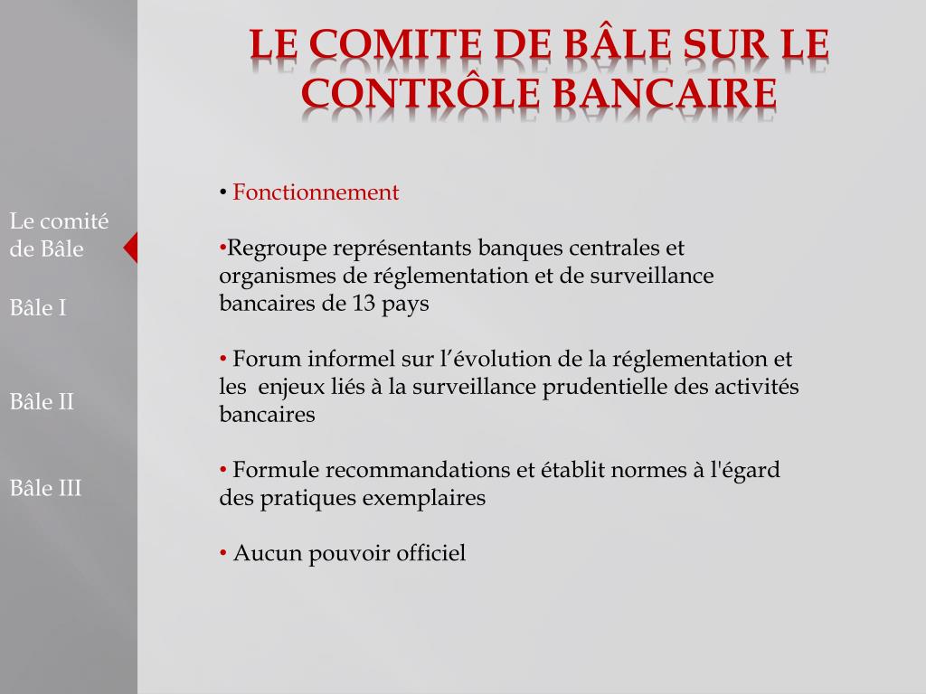 LE COMITE DE BÂLE SUR LE CONTRÔLE BANCAIRE • Fonctionnement • Regroupe représentants banques centrales et organismes de réglementation et de surveillance bancaires de 13 pays • Forum informel sur l’évolution de la réglementation et les enjeux liés à la surveillance prudentielle des activités bancaires • Formule recommandations et établit normes à l'égard des pratiques exemplaires • Aucunpouvoirofficiel Le comité de Bâle Bâle I Bâle II Bâle III
