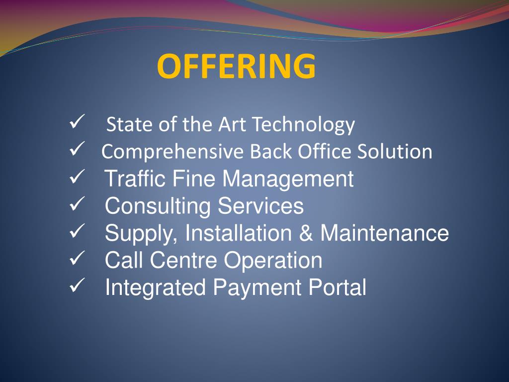 OFFERING • State of the Art Technology • Comprehensive Back Office Solution • Traffic Fine Management • Consulting Services • Supply, Installation & Maintenance • Call Centre Operation • Integrated Payment Portal