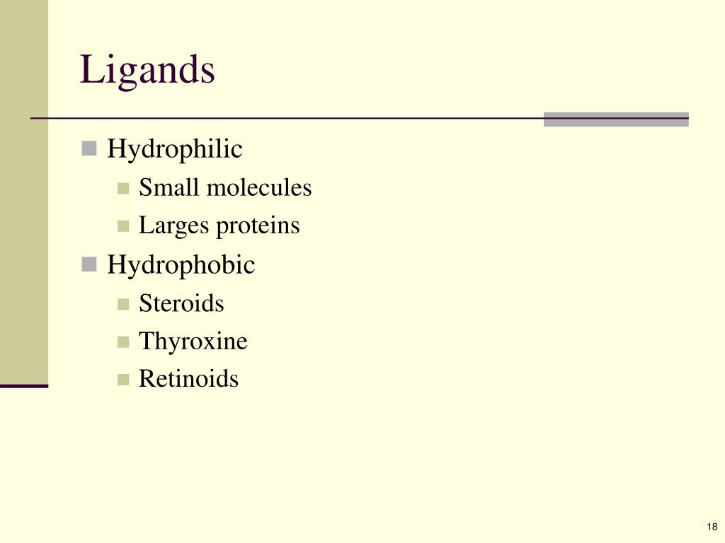 Ligands • Hydrophilic • Small molecules • Larges proteins • Hydrophobic • Steroids • Thyroxine • Retinoids 18