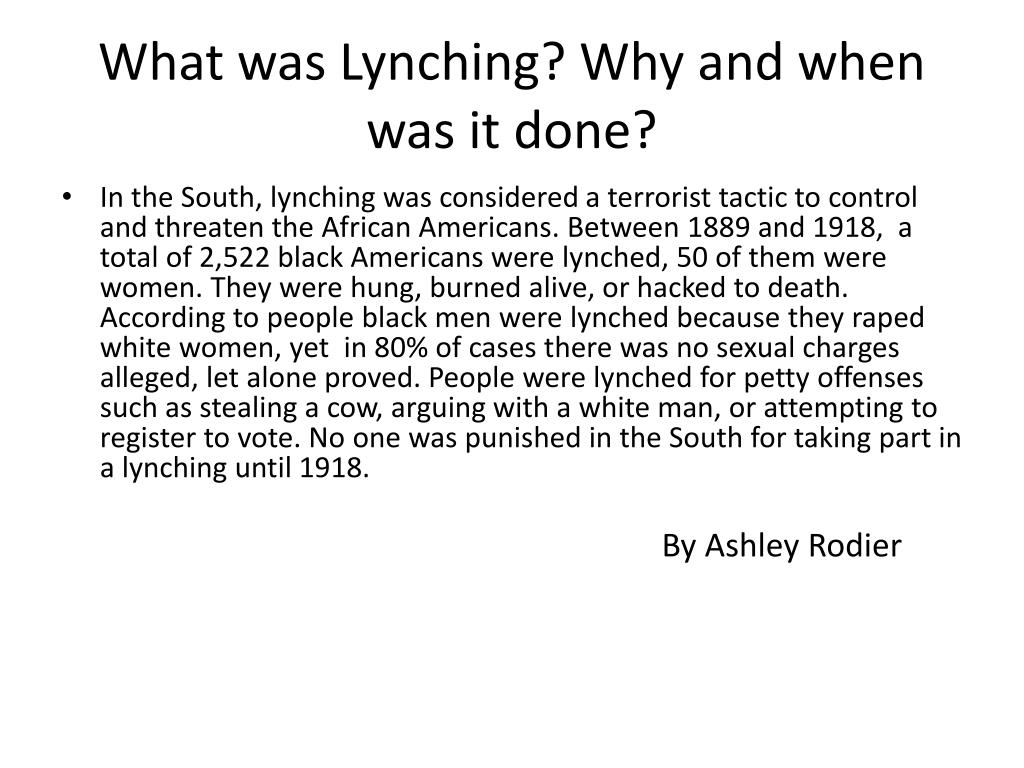 What was Lynching? Why and when was it done? • In the South, lynching was considered a terrorist tactic to control and threaten the African Americans. Between 1889 and 1918, a total of 2,522 black Americans were lynched, 50 of them were women. They were hung, burned alive, or hacked to death. According to people black men were lynched because they raped white women, yet in 80% of cases there was no sexual charges alleged, let alone proved. People were lynched for petty offenses such as stealing a cow, arguing with a white man, or attempting to register to vote. No one was punished in the South for taking part in a lynching until 1918. By Ashley Rodier