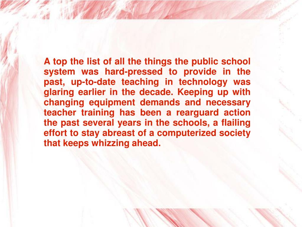A top the list of all the things the public school system was hard-pressed to provide in the past, up-to-date teaching in technology was glaring earlier in the decade. Keeping up with changing equipment demands and necessary teacher training has been a rearguard action the past several years in the schools, a flailing effort to stay abreast of a computerized society that keeps whizzing ahead.