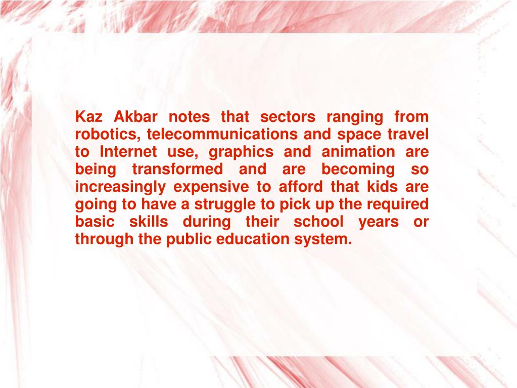 Kaz Akbar notes that sectors ranging from robotics, telecommunications and space travel to Internet use, graphics and animation are being transformed and are becoming so increasingly expensive to afford that kids are going to have a struggle to pick up the required basic skills during their school years or through the public education system.