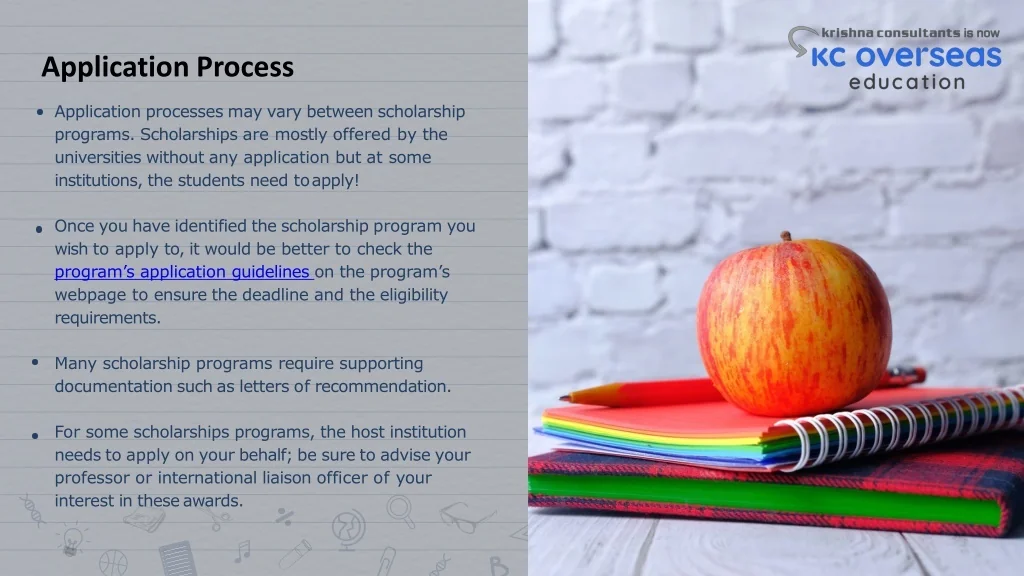 Application Process Applicationprocessesmayvarybetweenscholarship programs. Scholarships are mostly offered by the universities without any application but at some institutions, the students need toapply! Onceyouhaveidentifiedthescholarshipprogramyou wish to apply to, it would be better to check the program’s application guidelines on the program’s webpage to ensure the deadline and the eligibility requirements. Many scholarship programs require supporting documentationsuchaslettersofrecommendation. For some scholarships programs, the host institution needstoapplyonyourbehalf;besuretoadviseyour professor or international liaison officer of your interest in theseawards.