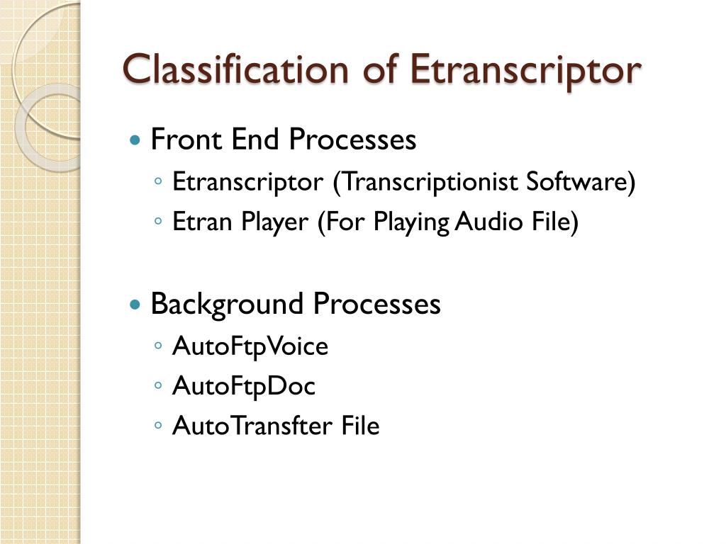 Classification of Etranscriptor • Front End Processes • Etranscriptor (Transcriptionist Software) • Etran Player (For Playing Audio File) • Background Processes • AutoFtpVoice • AutoFtpDoc • AutoTransfterFile