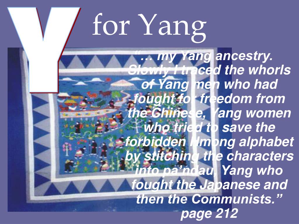 Y for Yang “… my Yang ancestry. Slowly I traced the whorls of Yang men who had fought for freedom from the Chinese, Yang women who tried to save the forbidden Hmong alphabet by stitching the characters into pa’ndau, Yang who fought the Japanese and then the Communists.” page 212