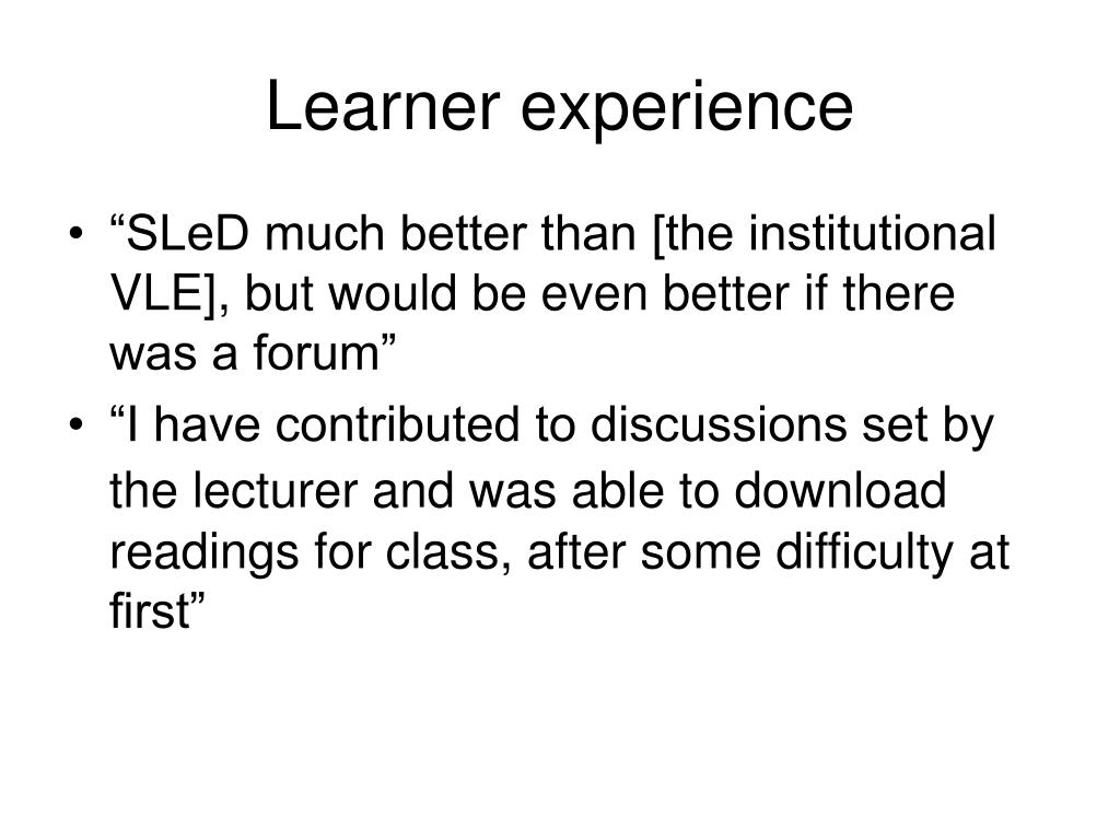 Learner experience • “SLeD much better than [the institutional VLE], but would be even better if there was a forum” • “I have contributed to discussions set by the lecturer and was able to downloadreadings for class, after some difficulty at first”