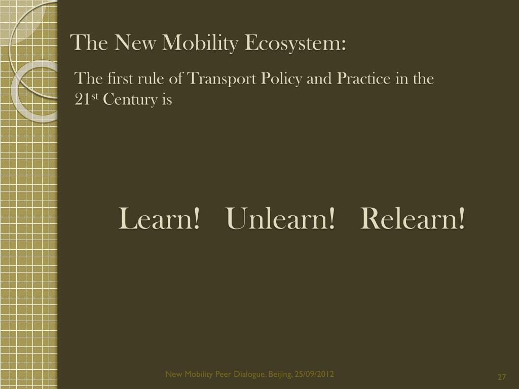 Learn! Unlearn! Relearn! The New Mobility Ecosystem: The first rule of Transport Policy and Practice in the 21st Century is New Mobility Peer Dialogue. Beijing, 25/09/2012