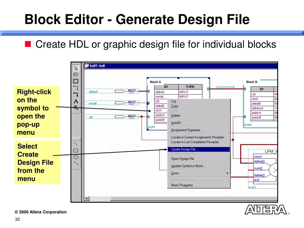 Block Editor - Generate Design File • Choose from the File Type and enter File Name Block A Block B ConnectorAB Select from AHDL, VHDL, Verilog or Graphic option