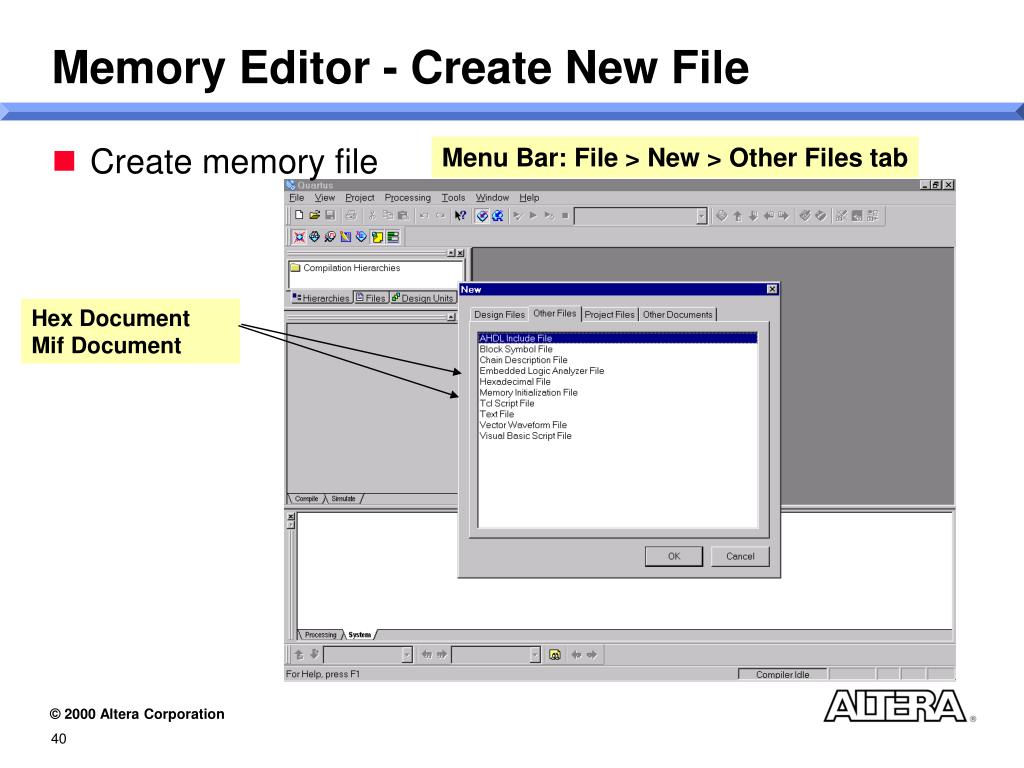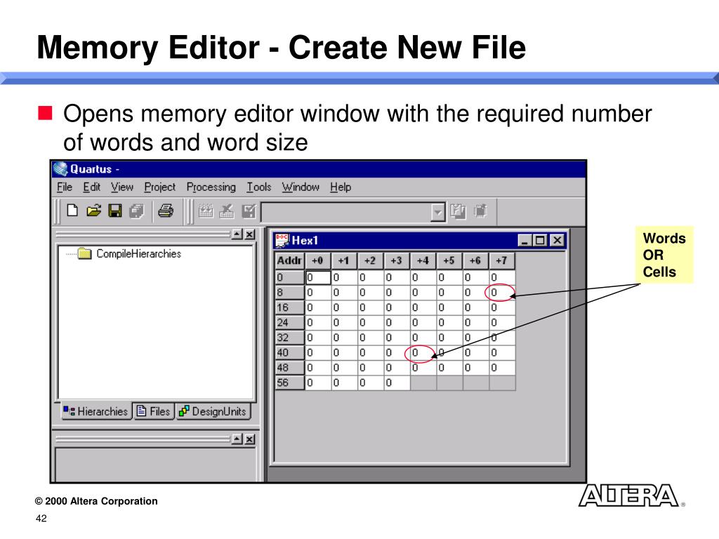 Memory Editor • Create or edit memory files in hex format (.hex) or memory initialization format (.mif) • For Design Entry • If you have a memory block in your design (ex. RAM, ROM, or Dual-port RAM), you can use the memory editor to create a memory initialization file to initialize your memory block • For Simulation • You can create an initialization file to initialize your memory during simulation
