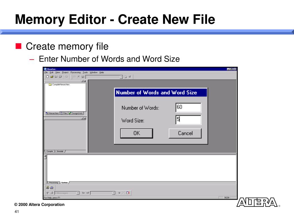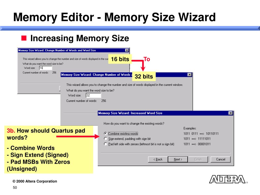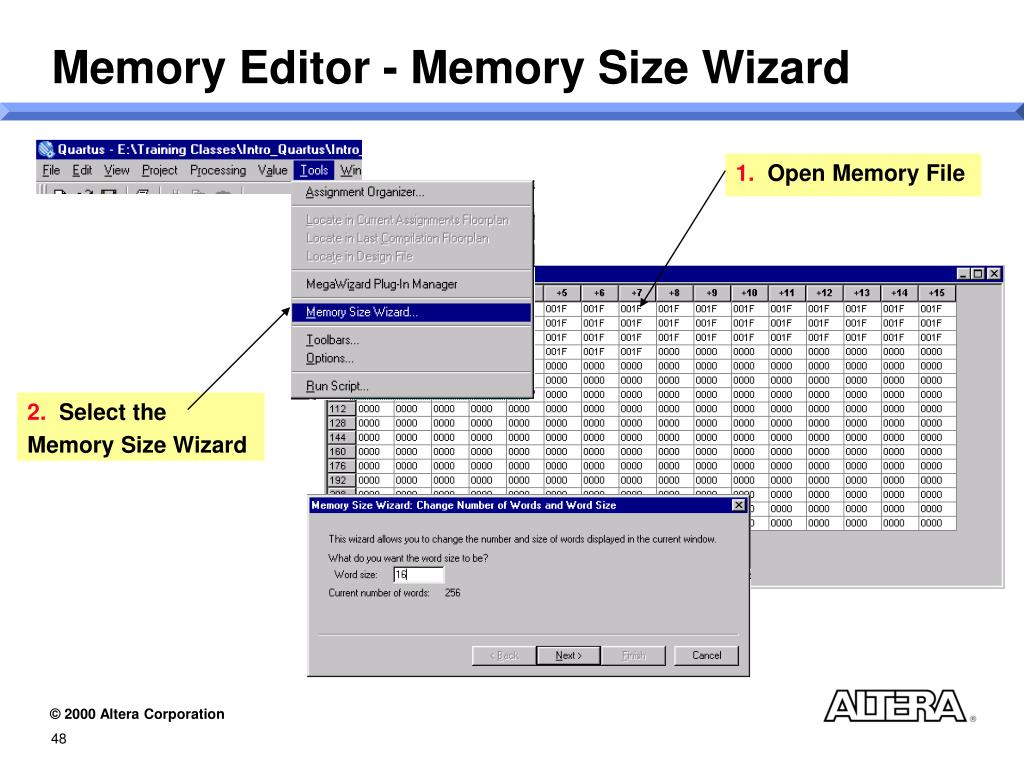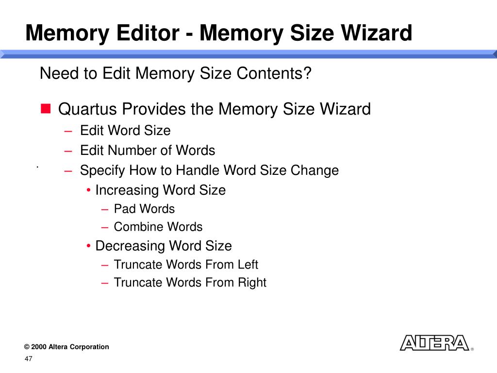 Memory Editor - Memory Size Wizard Need to Edit Memory Size Contents? • Quartus Provides the Memory Size Wizard • Edit Word Size • Edit Number of Words • Specify How to Handle Word Size Change • Increasing Word Size • Pad Words • Combine Words • Decreasing Word Size • Truncate Words From Left • Truncate Words From Right .