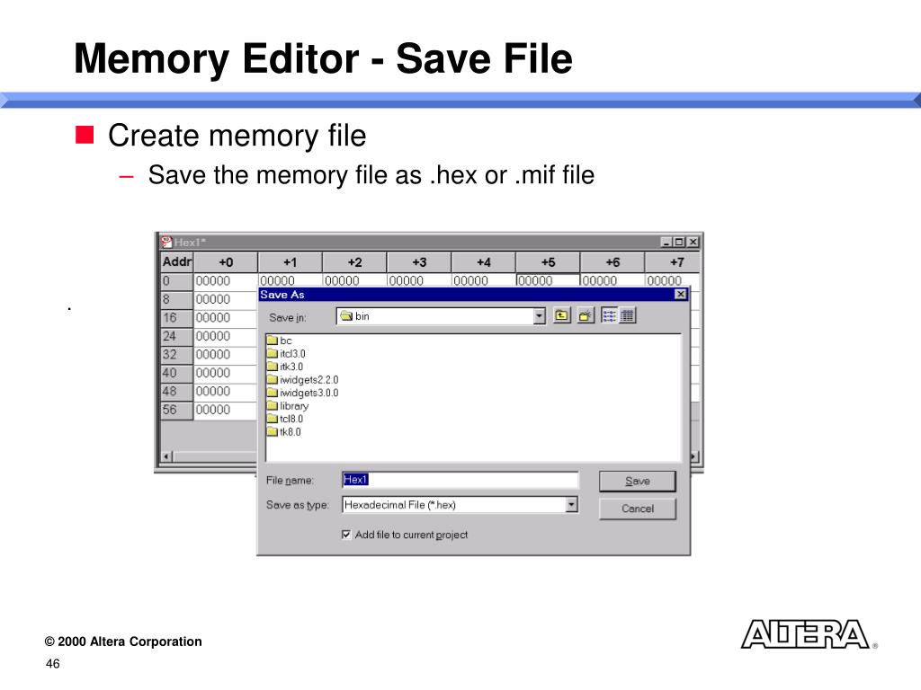 Memory Editor - Save File • Create memory file • Save the memory file as .hex or .mif file .