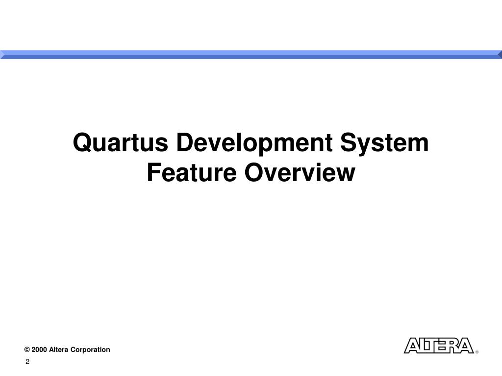Designing with Quartus. Quartus Development System Feature Overview. Quartus Development System. Quartus Development System features: Fully integrated design entry, processing, and verification tools: Multiple design entry methods Logic synthesis Place & route Simulation Timing analysis