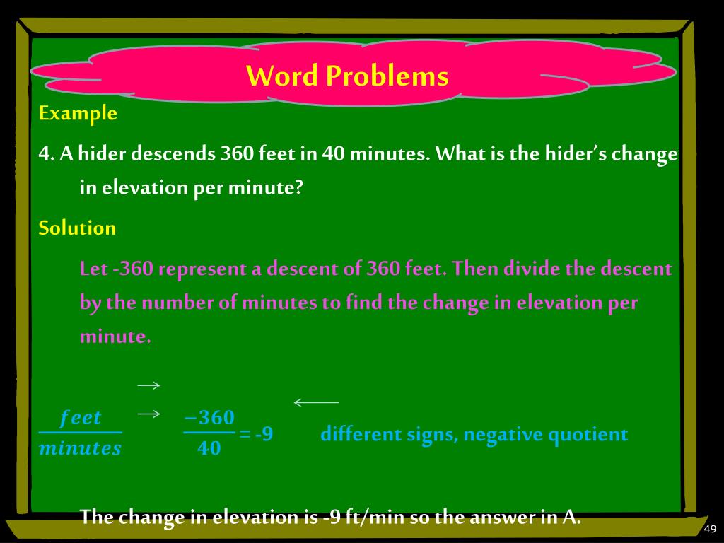 Word Problems Example 4. A hider descends 360 feet in 40 minutes. What is the hider’s change in elevation per minute? Solution Let -360 represent a descent of 360 feet. Then divide the descent by the number of minutes to find the change in elevation per minute. = -9 different signs, negative quotient The change in elevation is -9 ft/min so the answer in A.