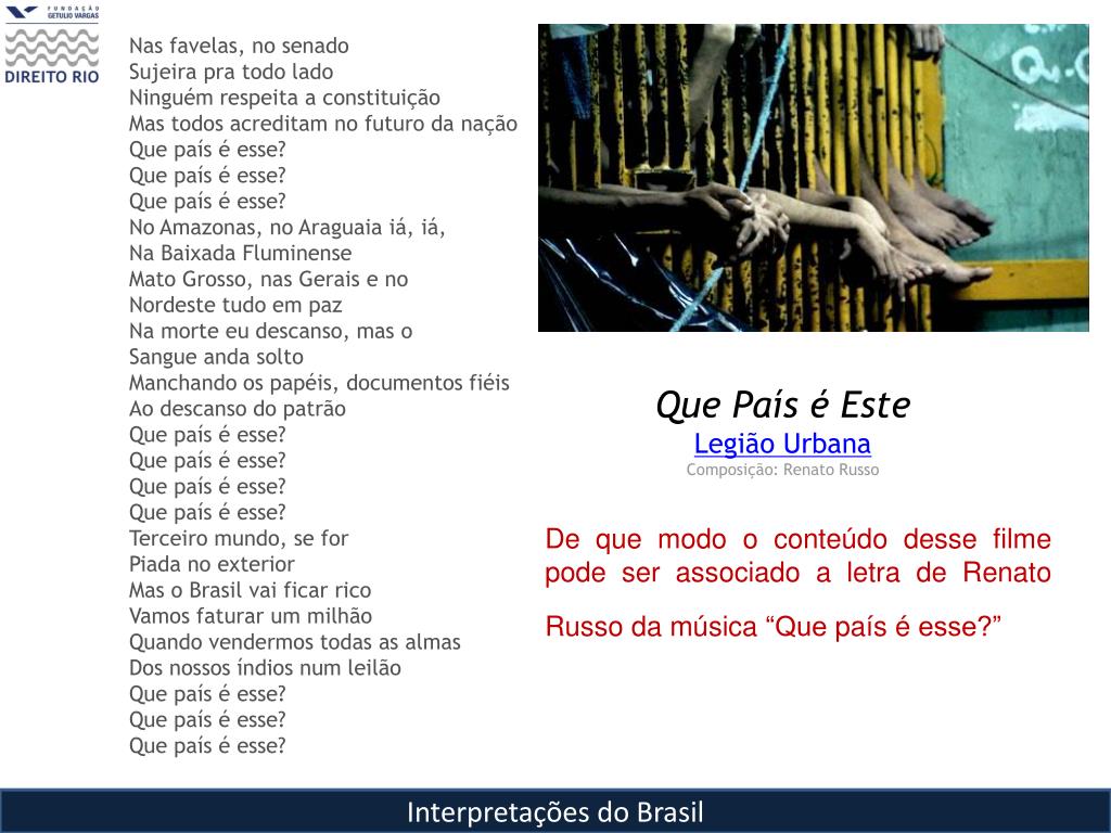 Nas favelas, no senadoSujeira pra todo ladoNinguém respeita a constituiçãoMas todos acreditam no futuro da naçãoQue país é esse?Que país é esse?Que país é esse?No Amazonas, no Araguaia iá, iá,Na Baixada FluminenseMato Grosso, nas Gerais e noNordeste tudo em pazNa morte eu descanso, mas oSangue anda soltoManchando os papéis, documentos fiéisAo descanso do patrãoQue país é esse?Que país é esse?Que país é esse?Que país é esse?Terceiro mundo, se forPiada no exteriorMas o Brasil vai ficar ricoVamos faturar um milhãoQuando vendermos todas as almasDos nossos índios num leilãoQue país é esse?Que país é esse?Que país é esse? Que País é Este Legião Urbana Composição: Renato Russo De que modo o conteúdo desse filme pode ser associado a letra de Renato Russo da música “Que país é esse?” Interpretações do Brasil