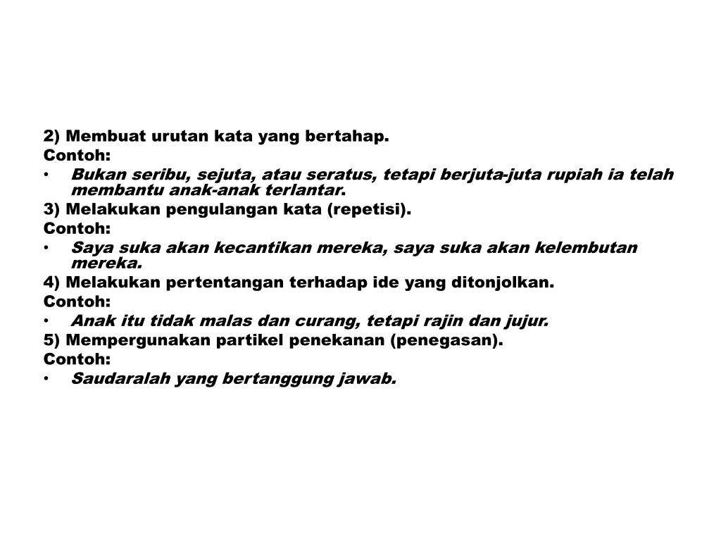 2) Membuat urutan kata yang bertahap. Contoh: • Bukan seribu, sejuta, atau seratus, tetapi berjuta-juta rupiah ia telah membantu anak-anak terlantar. 3) Melakukan pengulangan kata (repetisi). Contoh: • Saya suka akan kecantikan mereka, saya suka akan kelembutan mereka. 4) Melakukan pertentangan terhadap ide yang ditonjolkan. Contoh: • Anak itu tidak malas dan curang, tetapi rajin dan jujur. 5) Mempergunakan partikel penekanan (penegasan). Contoh: • Saudaralah yang bertanggung jawab.