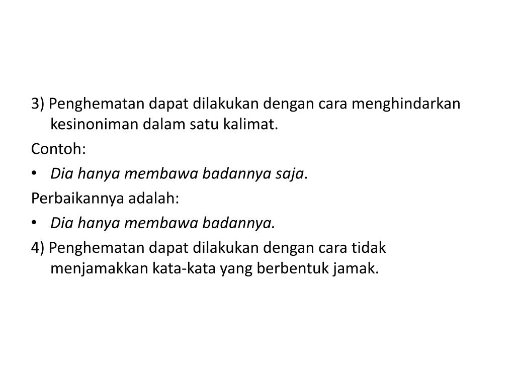 3) Penghematan dapat dilakukan dengan cara menghindarkan kesinoniman dalam satu kalimat. Contoh: • Dia hanya membawa badannya saja. Perbaikannya adalah: • Dia hanya membawa badannya. 4) Penghematan dapat dilakukan dengan cara tidak menjamakkan kata-kata yang berbentuk jamak.