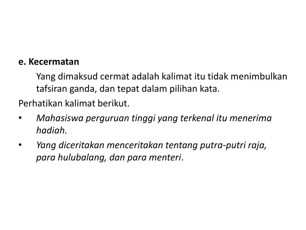 e. Kecermatan Yang dimaksud cermat adalah kalimat itu tidak menimbulkan tafsiran ganda, dan tepat dalam pilihan kata. Perhatikan kalimat berikut. • Mahasiswa perguruan tinggi yang terkenal itu menerima hadiah. • Yang diceritakan menceritakan tentang putra-putri raja, para hulubalang, dan para menteri.