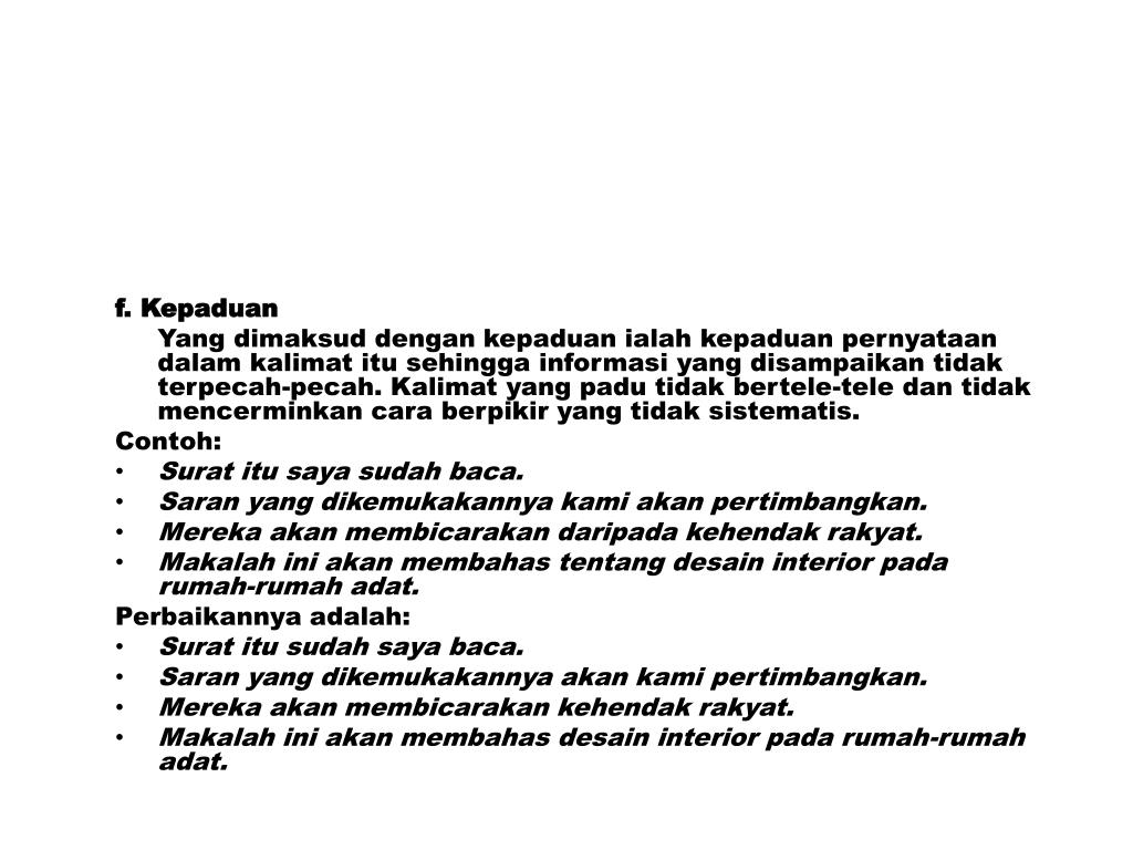 f. Kepaduan Yang dimaksud dengan kepaduan ialah kepaduan pernyataan dalam kalimat itu sehingga informasi yang disampaikan tidak terpecah-pecah. Kalimat yang padu tidak bertele-tele dan tidak mencerminkan cara berpikir yang tidak sistematis. Contoh: • Surat itu saya sudah baca. • Saran yang dikemukakannya kami akan pertimbangkan. • Mereka akan membicarakan daripada kehendak rakyat. • Makalah ini akan membahas tentang desain interior pada rumah-rumah adat. Perbaikannya adalah: • Surat itu sudah saya baca. • Saran yang dikemukakannya akan kami pertimbangkan. • Mereka akan membicarakan kehendak rakyat. • Makalah ini akan membahas desain interior pada rumah-rumah adat.