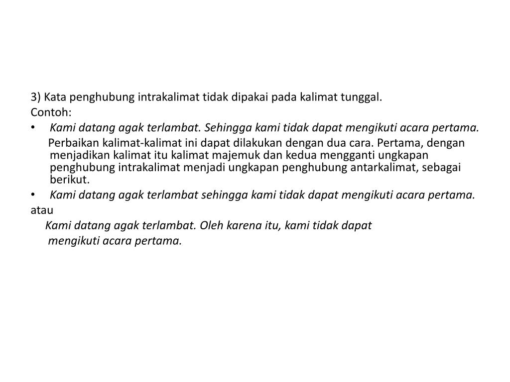 3) Kata penghubung intrakalimat tidak dipakai pada kalimat tunggal. Contoh: • Kami datang agak terlambat. Sehingga kami tidak dapat mengikuti acara pertama. Perbaikan kalimat-kalimat ini dapat dilakukan dengan dua cara. Pertama, dengan menjadikan kalimat itu kalimat majemuk dan kedua mengganti ungkapan penghubung intrakalimat menjadi ungkapan penghubung antarkalimat, sebagai berikut. • Kami datang agak terlambat sehingga kami tidak dapat mengikuti acara pertama. atau Kami datang agak terlambat. Oleh karena itu, kami tidak dapat mengikuti acara pertama.