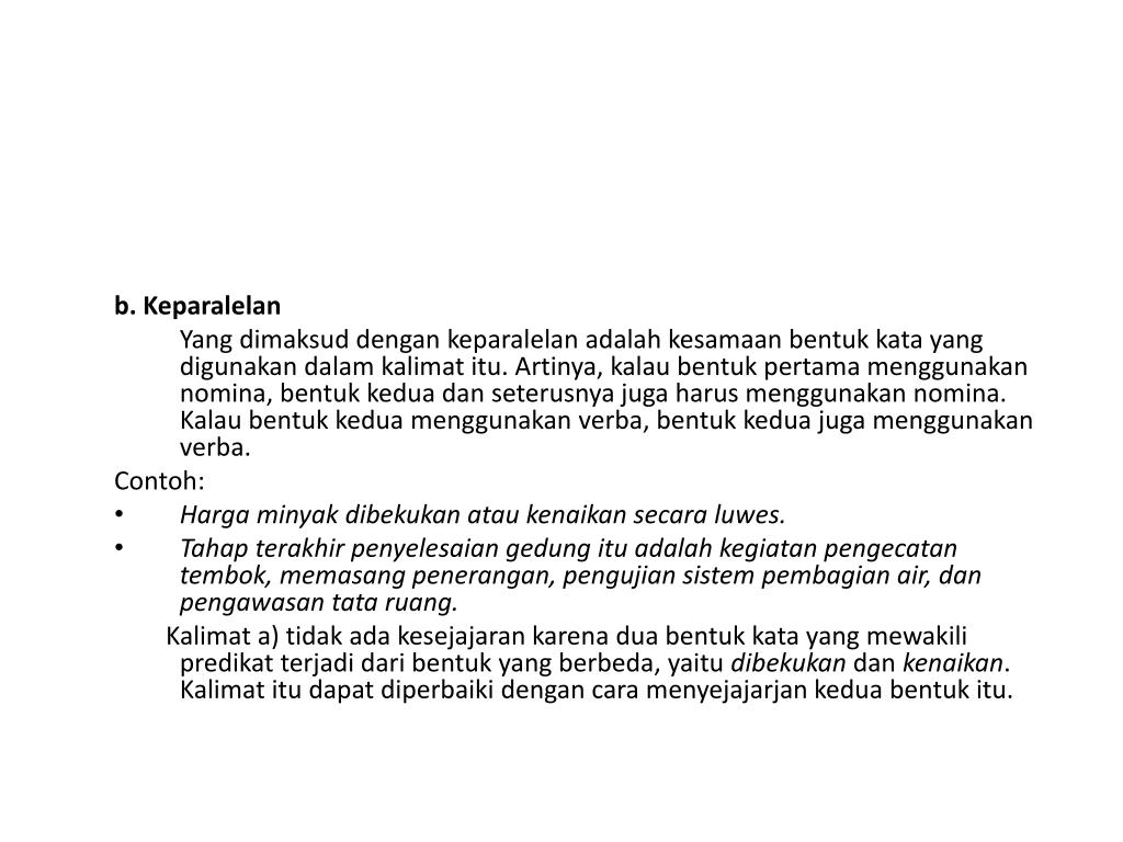 Harga minyak dibekukan atau dinaikkan secara luwes. Kalimat b) tidak memiliki kesjajaran karena kata yang menduduki predikat tidak sama bentuknya, yaitu kata pengecatan, memasang, pengujian, dan pengaturan. Kalimat itu akan baik kalau diubah menjadi predikat yang nominal. • Tahap terakhir penyelesaian gedung itu adalah kegiatan pengecatan tembok, pemasangan penerangan, pengujian sistem pembagian air, dan pengawasan tata ruang.