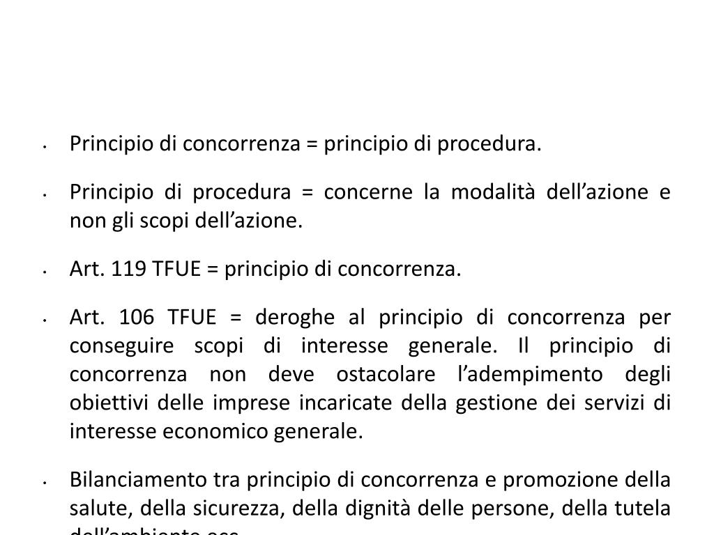 Principio di concorrenza = principio di procedura. • Principio di procedura = concerne la modalità dell’azione e non gli scopi dell’azione. • Art. 119 TFUE = principio di concorrenza. • Art. 106 TFUE = deroghe al principio di concorrenza per conseguire scopi di interesse generale. Il principio di concorrenza non deve ostacolare l’adempimento degli obiettivi delle imprese incaricate della gestione dei servizi di interesse economico generale. • Bilanciamento tra principio di concorrenza e promozione della salute, della sicurezza, della dignità delle persone, della tutela dell’ambiente ecc.