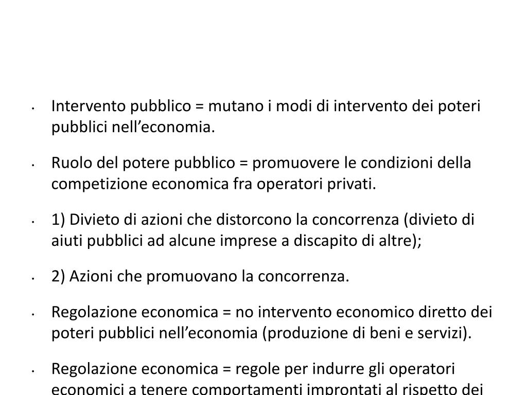 Intervento pubblico = mutano i modi di intervento dei poteri pubblici nell’economia. • Ruolo del potere pubblico = promuovere le condizioni della competizione economica fra operatori privati. • 1) Divieto di azioni che distorcono la concorrenza (divieto di aiuti pubblici ad alcune imprese a discapito di altre); • 2) Azioni che promuovano la concorrenza. • Regolazione economica = no intervento economico diretto dei poteri pubblici nell’economia (produzione di beni e servizi). • Regolazione economica = regole per indurre gli operatori economici a tenere comportamenti improntati al rispetto dei principi del mercato e della concorrenza.