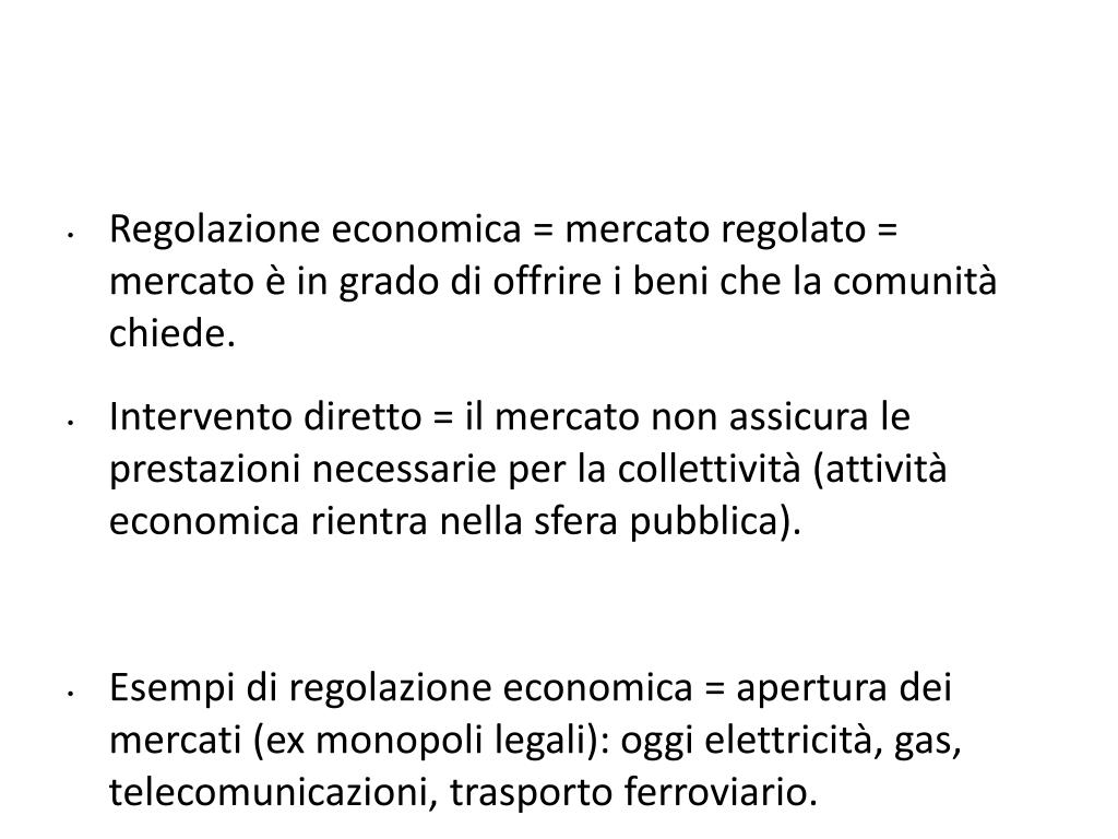 Regolazione economica = mercato regolato = mercato è in grado di offrire i beni che la comunità chiede. • Intervento diretto = il mercato non assicura le prestazioni necessarie per la collettività (attività economica rientra nella sfera pubblica). • Esempi di regolazione economica = apertura dei mercati (ex monopoli legali): oggi elettricità, gas, telecomunicazioni, trasporto ferroviario. • Esempio di intervento diretto = ENEL 1962 (art. 43 Cost.)