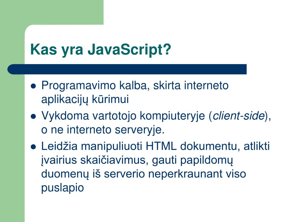 Kas yra JavaScript? • Programavimo kalba, skirta interneto aplikacijų kūrimui • Vykdoma vartotojo kompiuteryje (client-side), o ne interneto serveryje. • Leidžia manipuliuoti HTML dokumentu, atlikti įvairius skaičiavimus, gauti papildomų duomenų iš serverio neperkraunant viso puslapio