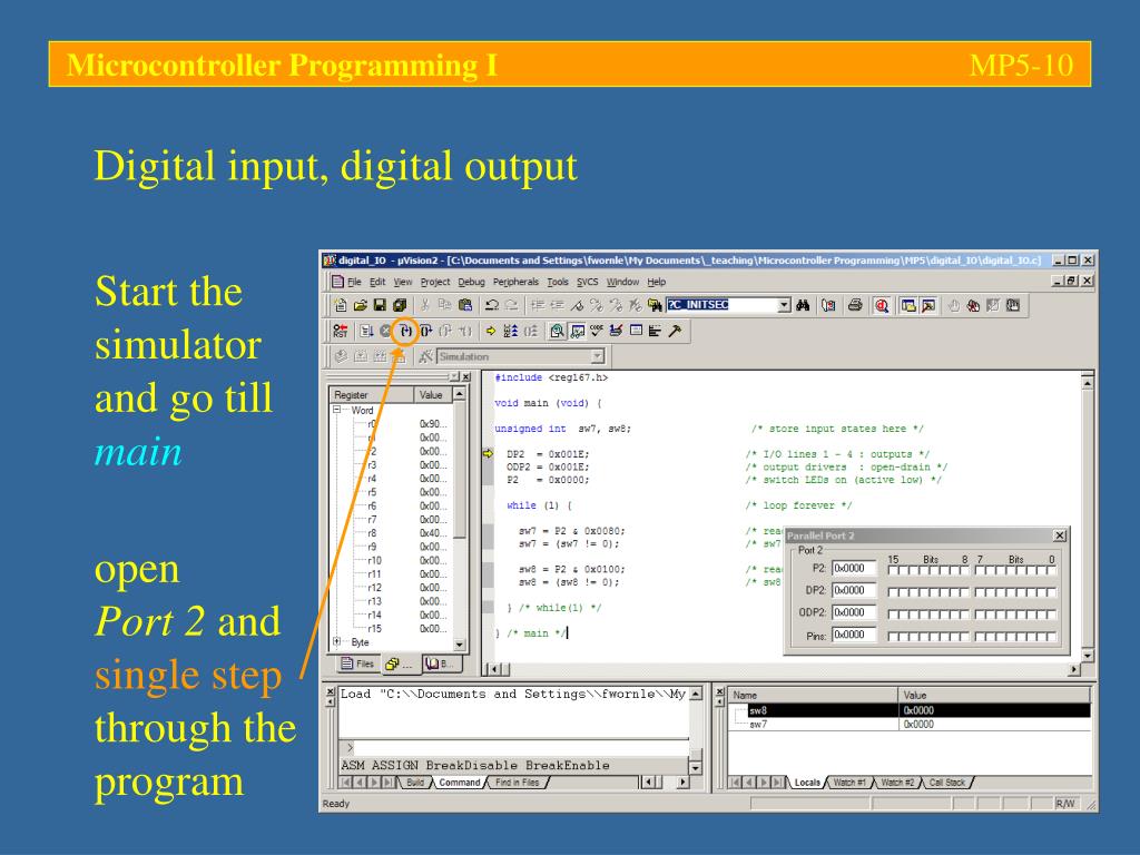 Microcontroller Programming I MP5-10 Digital input, digital output Start the simulator and go till main open Port 2 and single step through the program