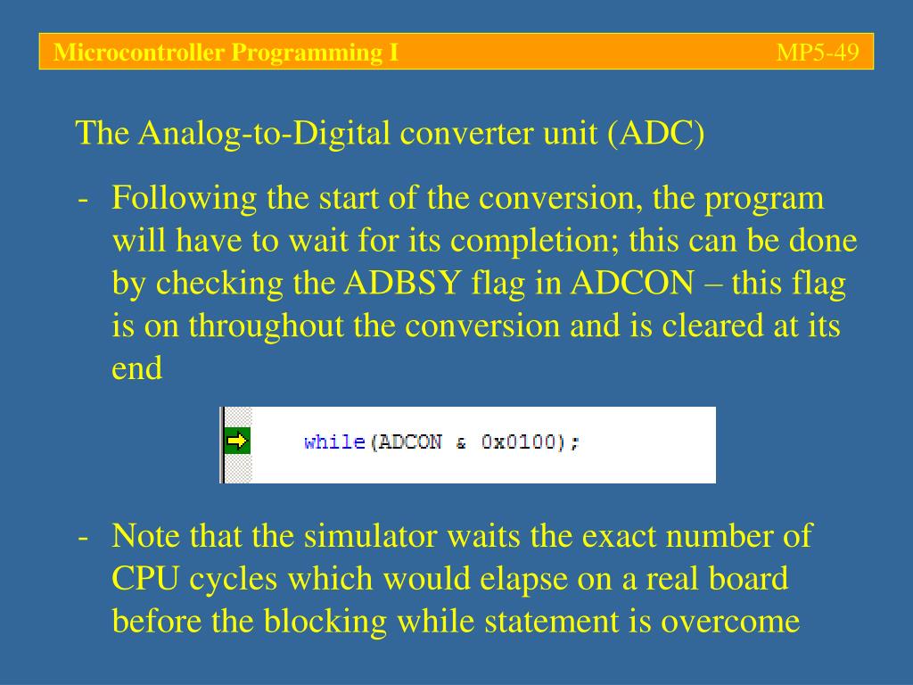 Microcontroller Programming I MP5-49 The Analog-to-Digital converter unit (ADC) - Following the start of the conversion, the program will have to wait for its completion; this can be done by checking the ADBSY flag in ADCON – this flag is on throughout the conversion and is cleared at its end - Note that the simulator waits the exact number of CPU cycles which would elapse on a real board before the blocking while statement is overcome