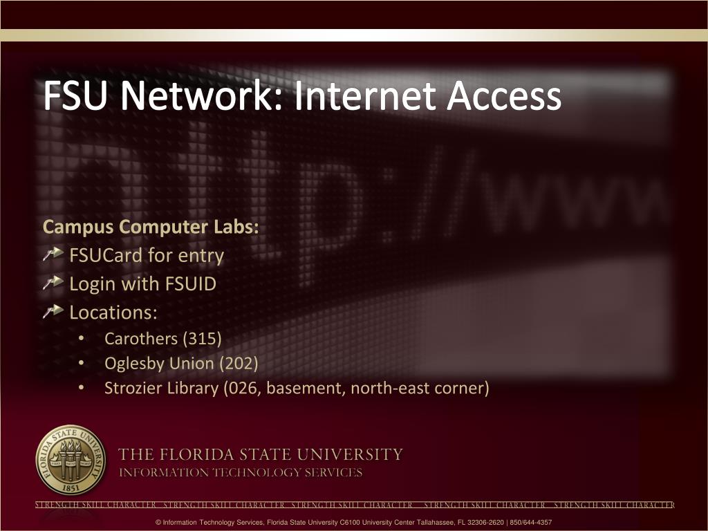 FSU Network: Internet Access Campus Computer Labs: FSUCard for entry Login with FSUID Locations: Carothers (315) Oglesby Union (202) Strozier Library (026, basement, north-east corner)
