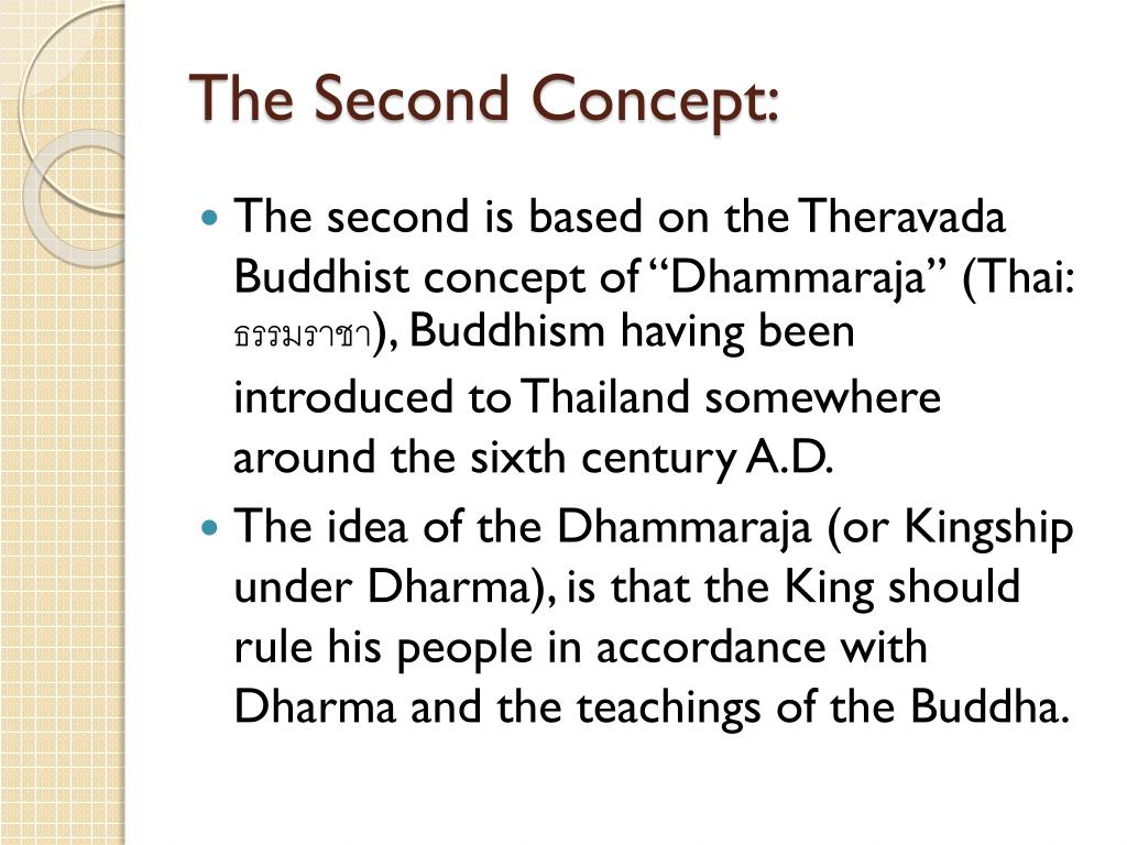 The Second Concept: • The second is based on the Theravada Buddhist concept of “Dhammaraja” (Thai: ธรรมราชา), Buddhism having been introduced to Thailand somewhere around the sixth century A.D. • The idea of the Dhammaraja (or Kingship under Dharma), is that the King should rule his people in accordance with Dharma and the teachings of the Buddha.